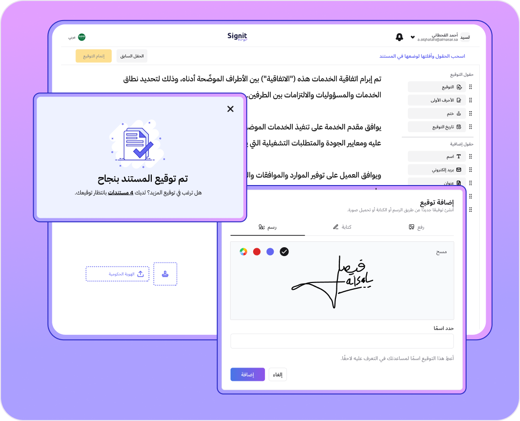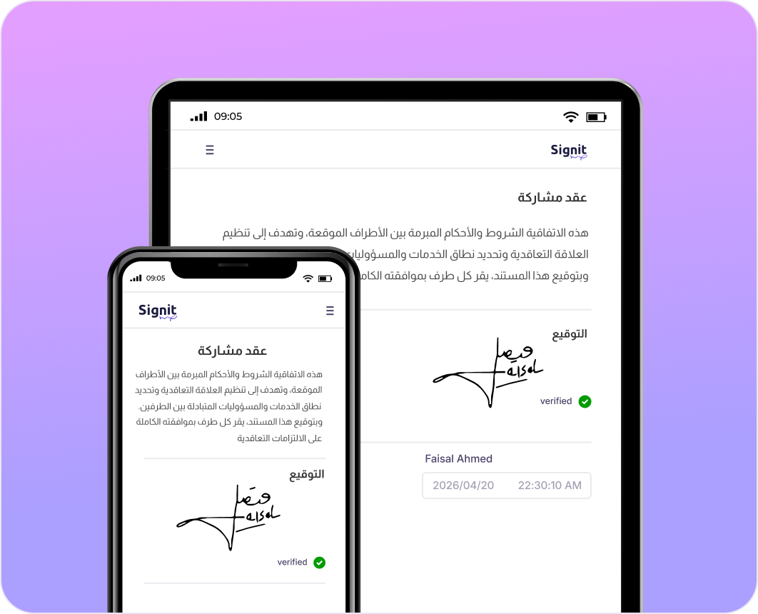 أرسل، وقّع، وأدر اتفاقياتك الملزمة قانونيا في مكان واحد. متوافقة تماماً مع الأنظمة السعودية ومحل ثقة من الشركات الكبرى في المملكة