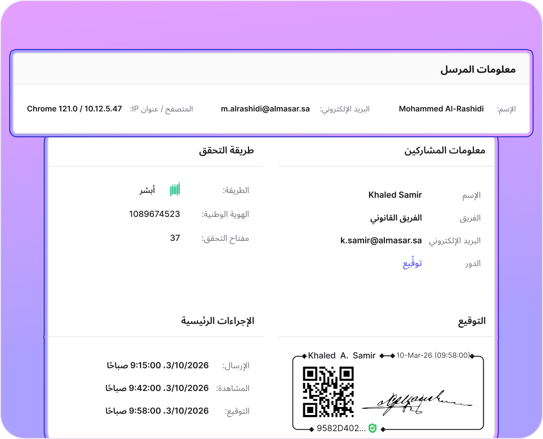 مقدم خدمات ثقة مرخص، البيانات مستضافة محلياً، والتواقيع ملزمة قانونيا بالأنظمة السعودية.