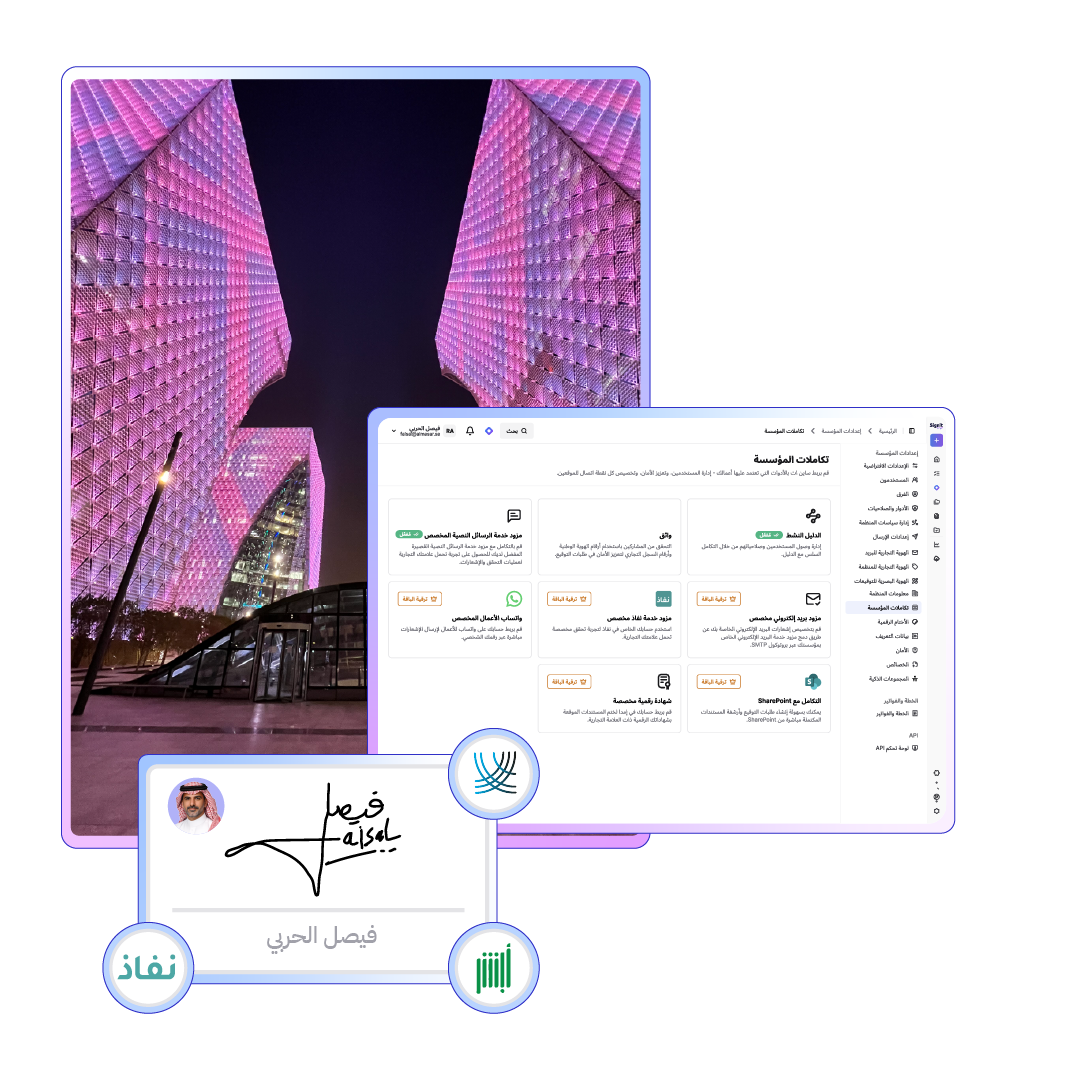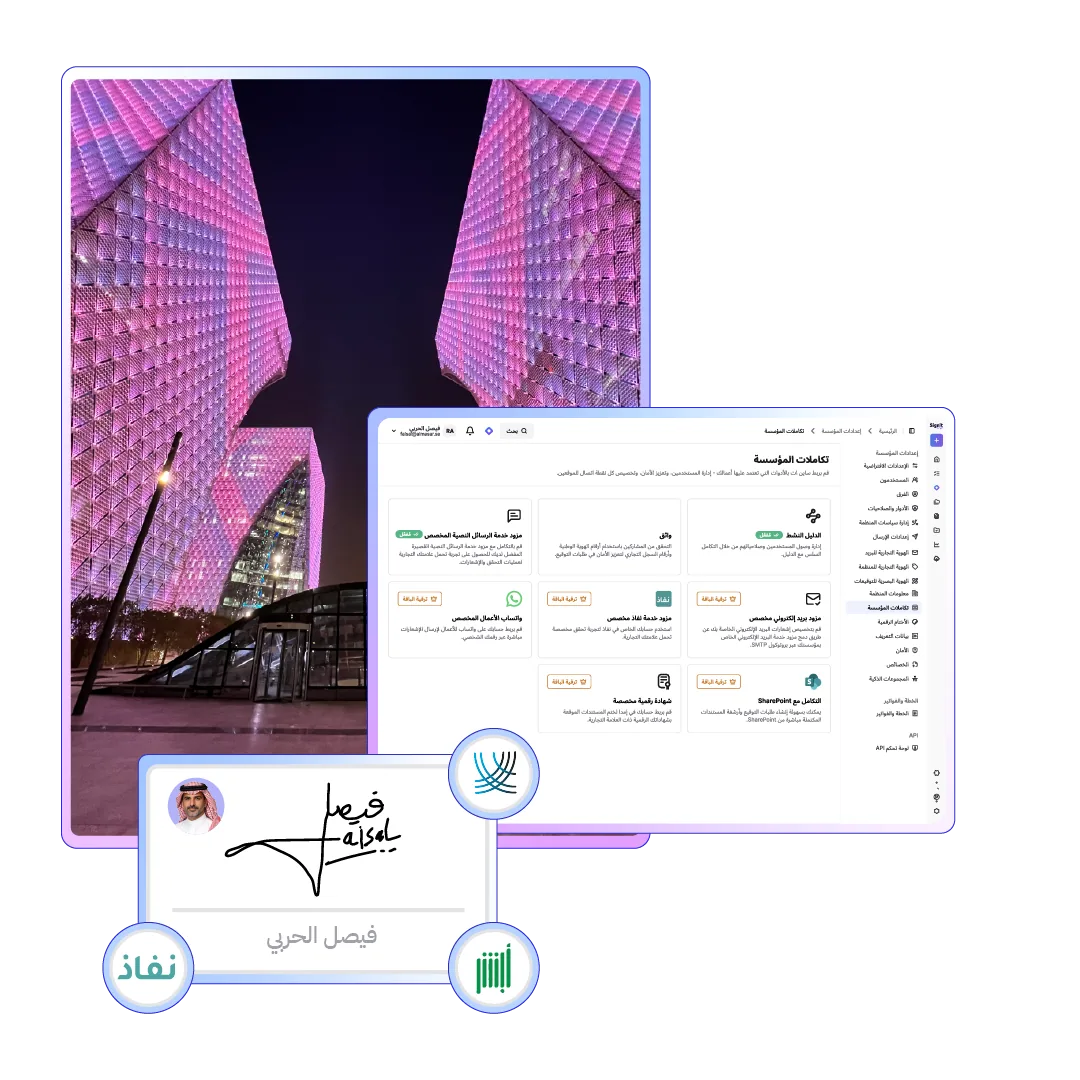 العمل على منصة مرخصة من هيئة الحكومة الرقمية ومتوافقة مع نظام حماية البيانات الشخصية والمركز الوطني لإدارة البيانات وNCA ECC — مما يمنح مؤسستك الثقة في كل موافقة وتوقيع إلكتروني.