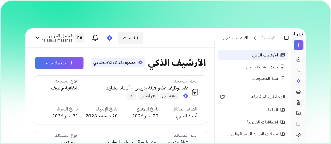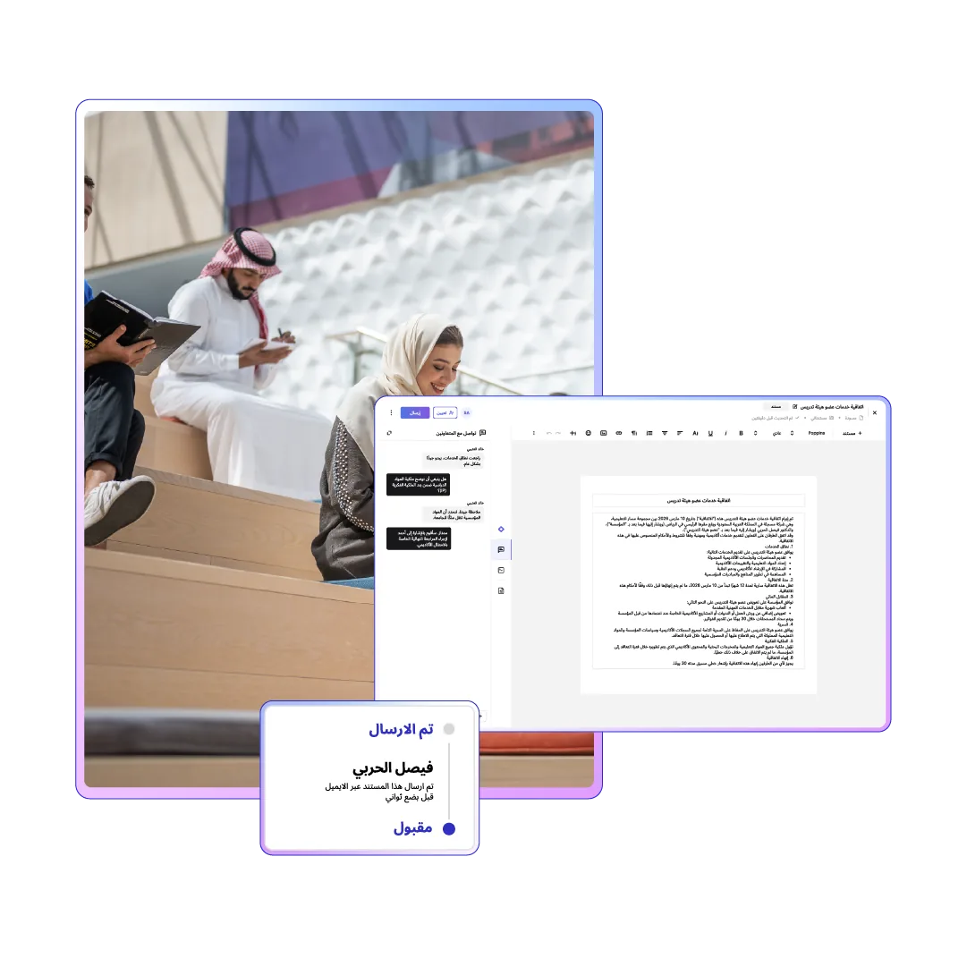 مكّن فرقك الأكاديمية والموارد البشرية والإدارية من إنشاء وتوقيع وإدارة كل عقد بأمان — مع دقة الذكاء الاصطناعي ومسارات التدقيق والامتثال السعودي المدمج.