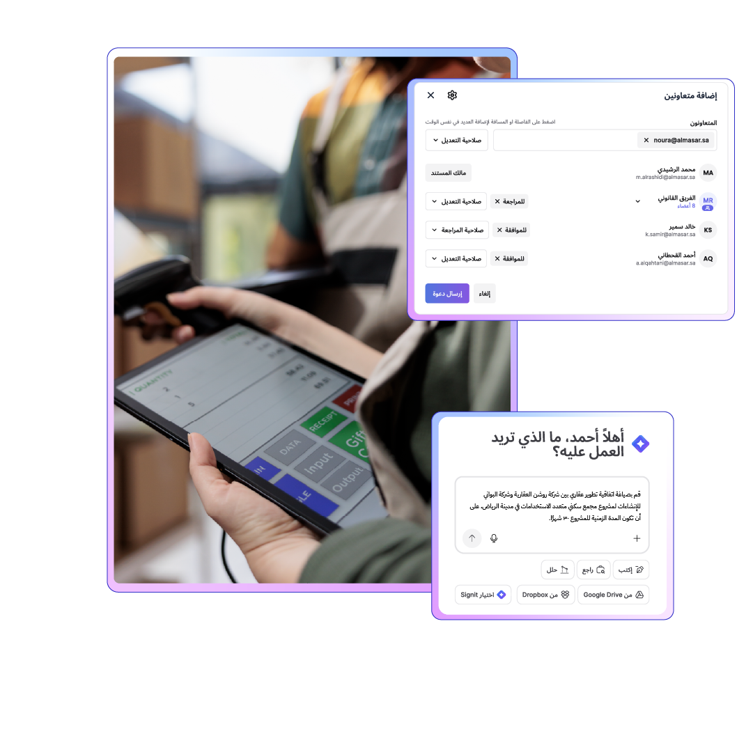 مكّن فرق المشتريات والعمليات والشؤون القانونية لديك بمنصة موحدة لرقمنة وتوقيع وإدارة كل اتفاقية مورد ومتجر بشكل آمن — متوافقة تماماً ومستضافة في المملكة العربية السعودية.