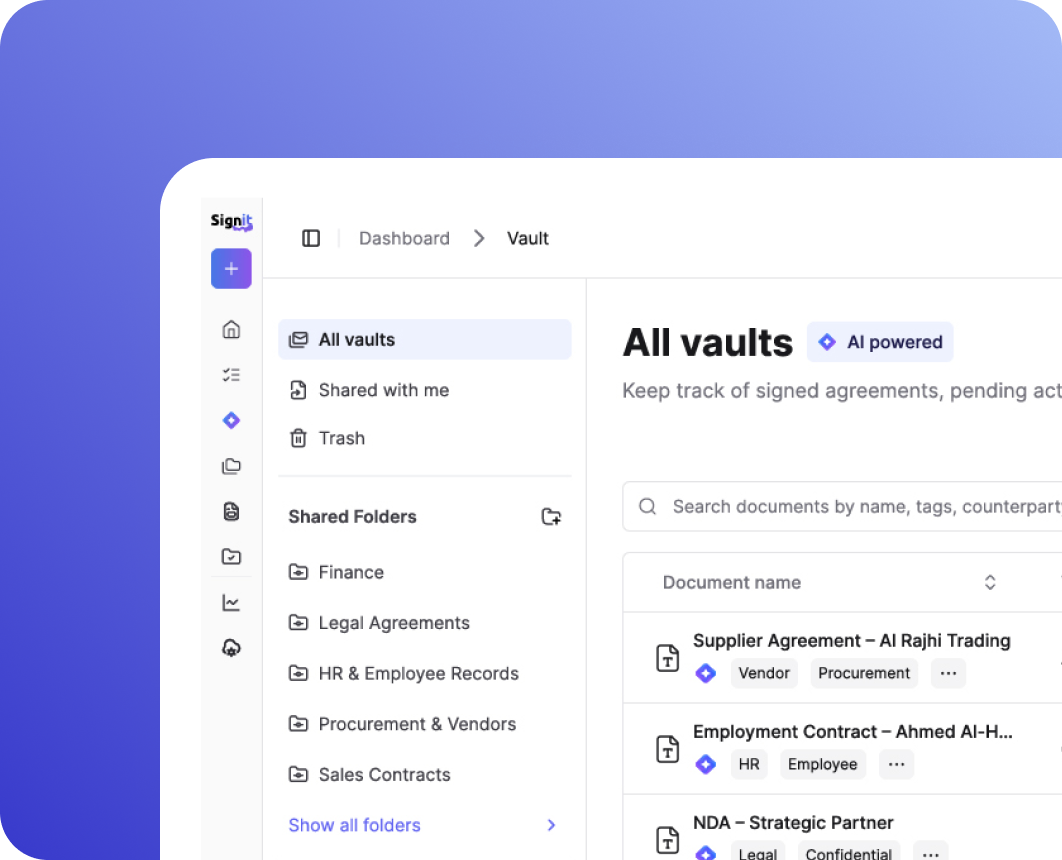 Yes — Signit is built with enterprise-grade security, AES-256 encryption, 2FA, and full PDPL/NDMO compliance. All data is hosted inside Saudi Arabia.