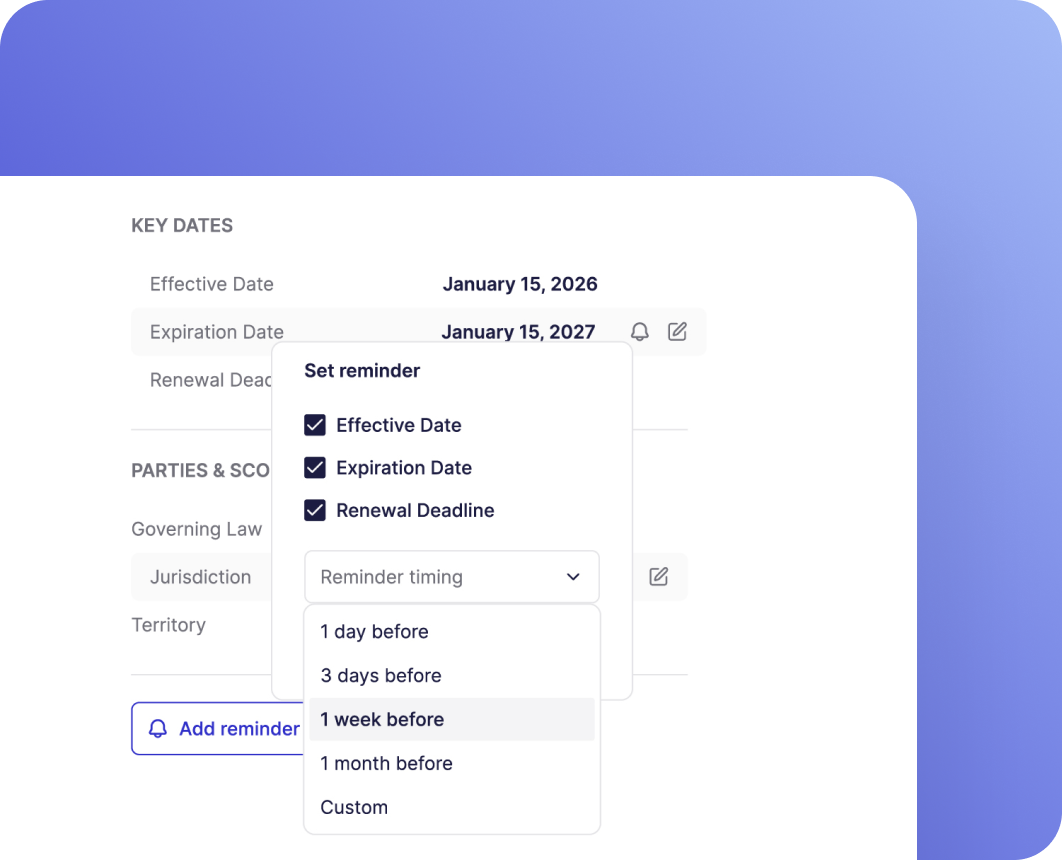 - Auto-extract obligations, milestones, and compliance triggers