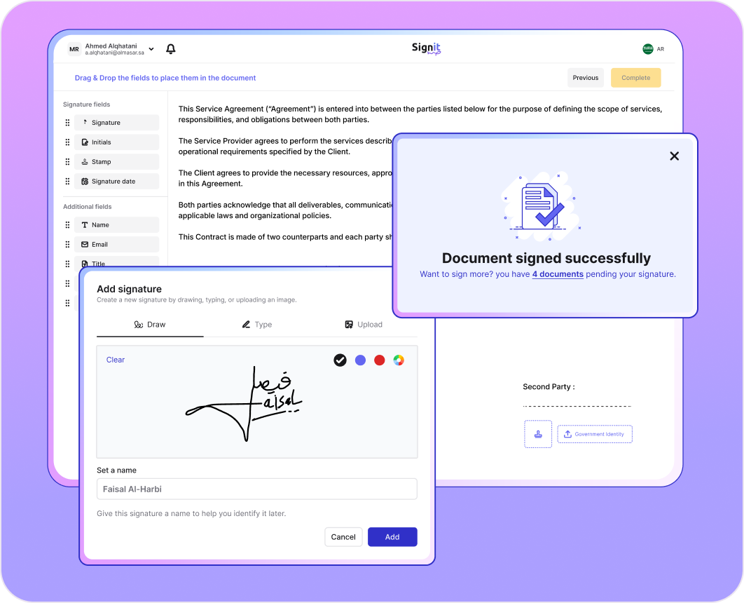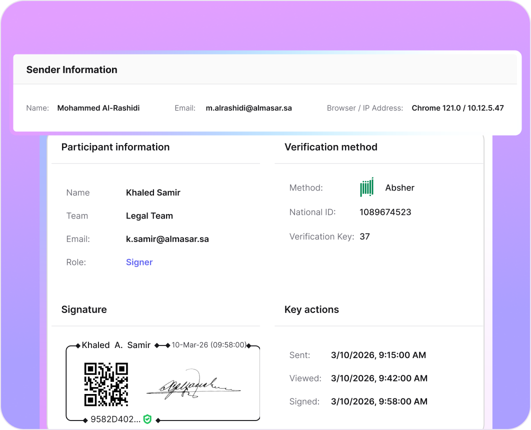 Send, sign and manage legally binding agreements in one place — fully compliant with Saudi regulations and trusted by enterprises across the Kingdom.