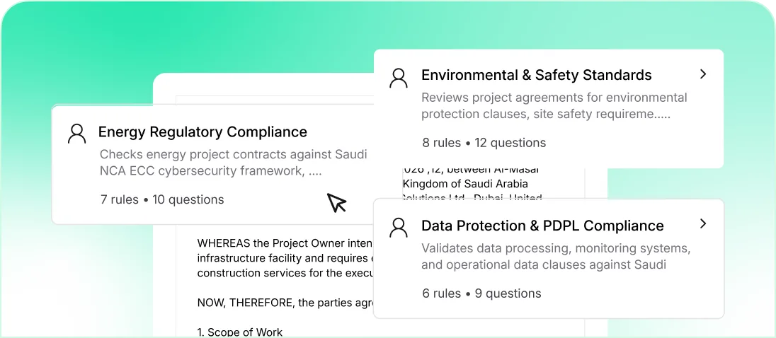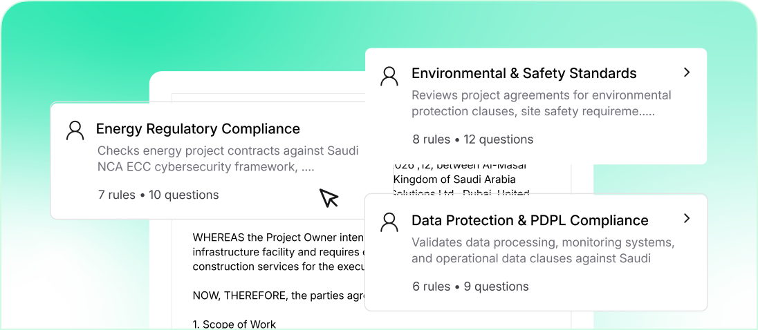 Standardize templates, clauses, and approval paths aligned with NCA ECC, PDPL, and sector-specific safety and regulatory requirements.