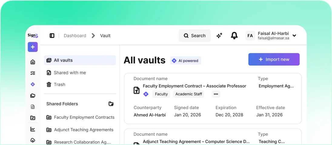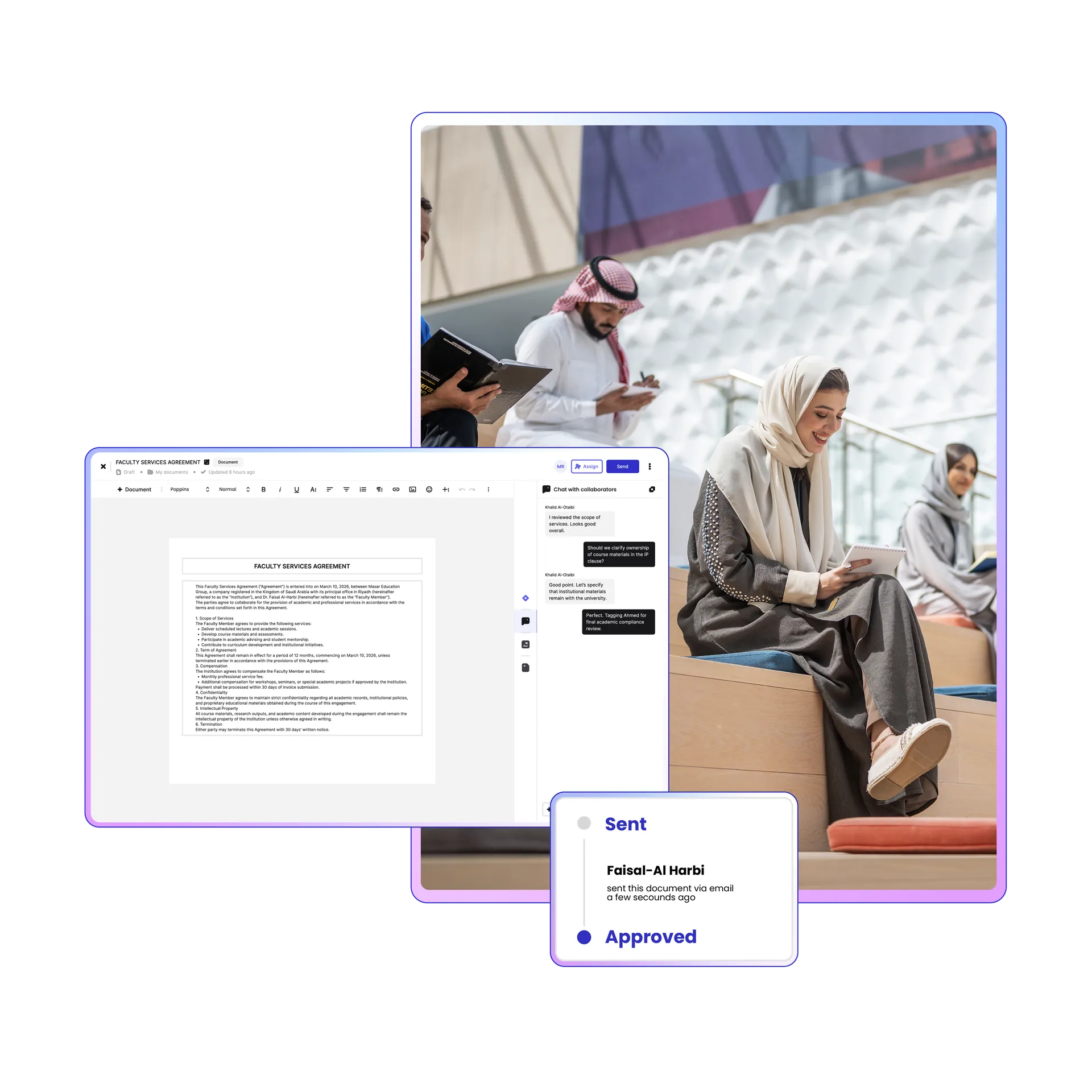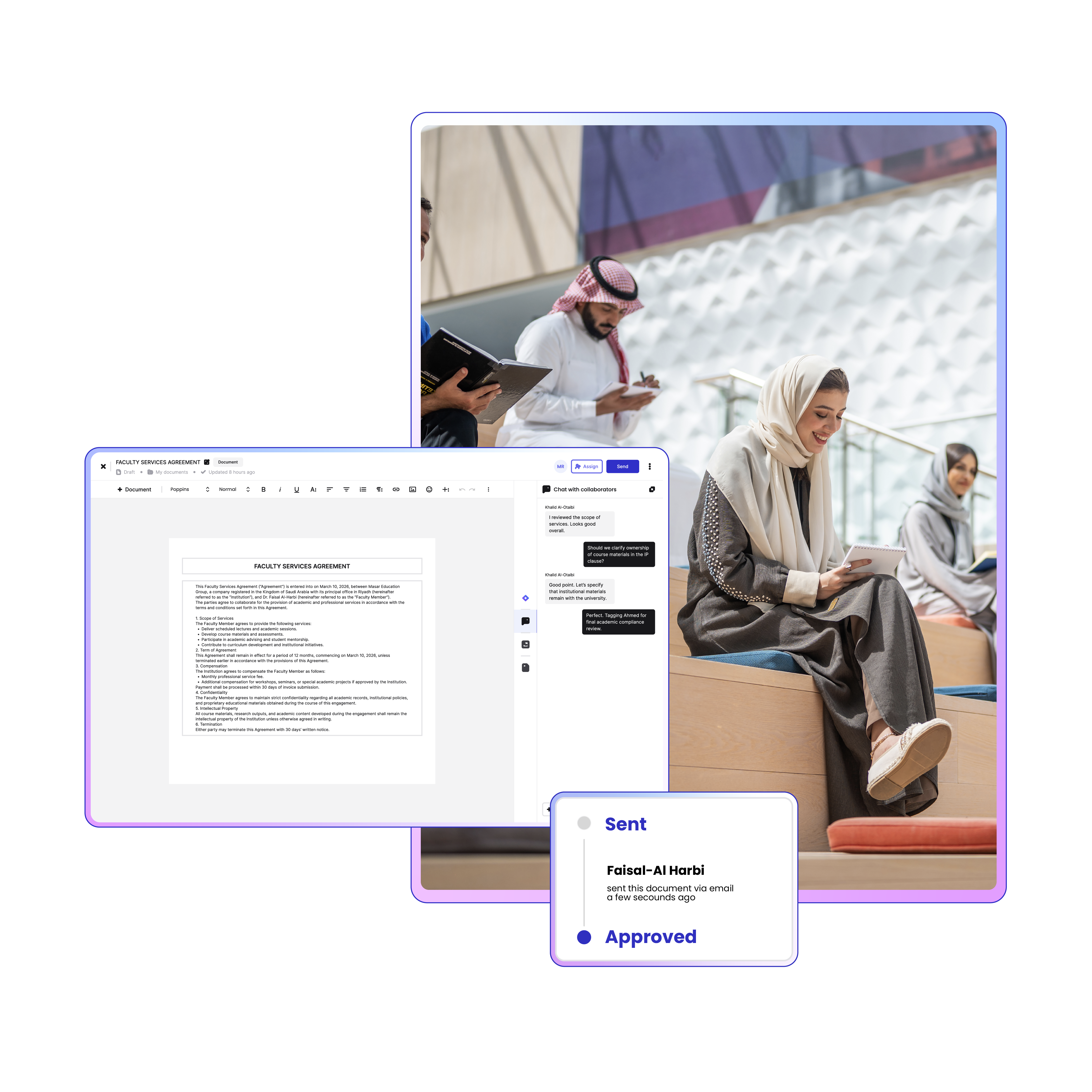 Empower your academic, HR, and administrative teams to create, sign, and manage every contract securely — with AI precision, audit trails, and Saudi compliance built in.