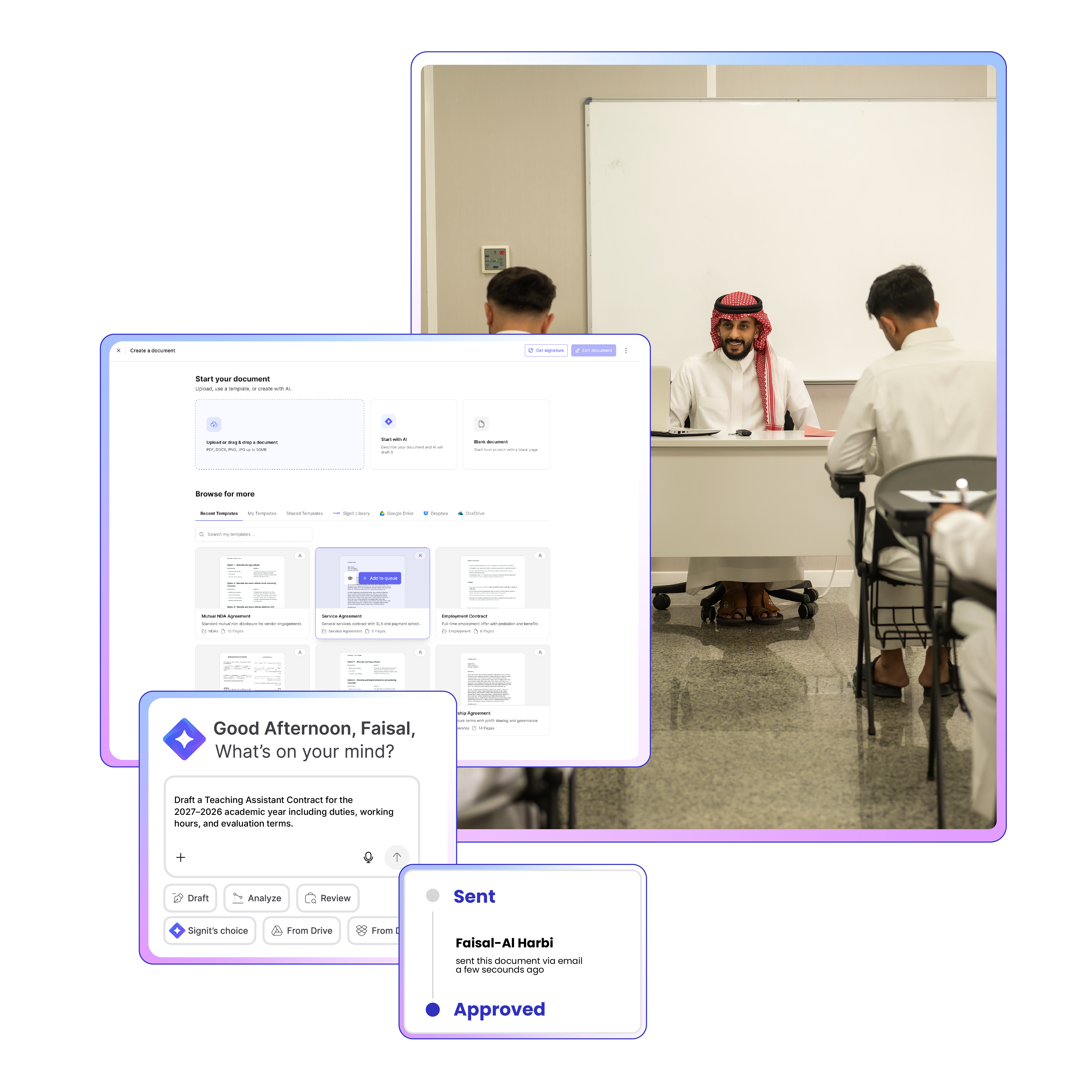 Signit helps K–12 schools and education groups streamline staff contracts, supplier agreements, and parental consent forms in one easy-to-use, Saudi-compliant platform. Reduce paperwork, speed up approvals, and maintain complete control with secure digital signing and audit trails.