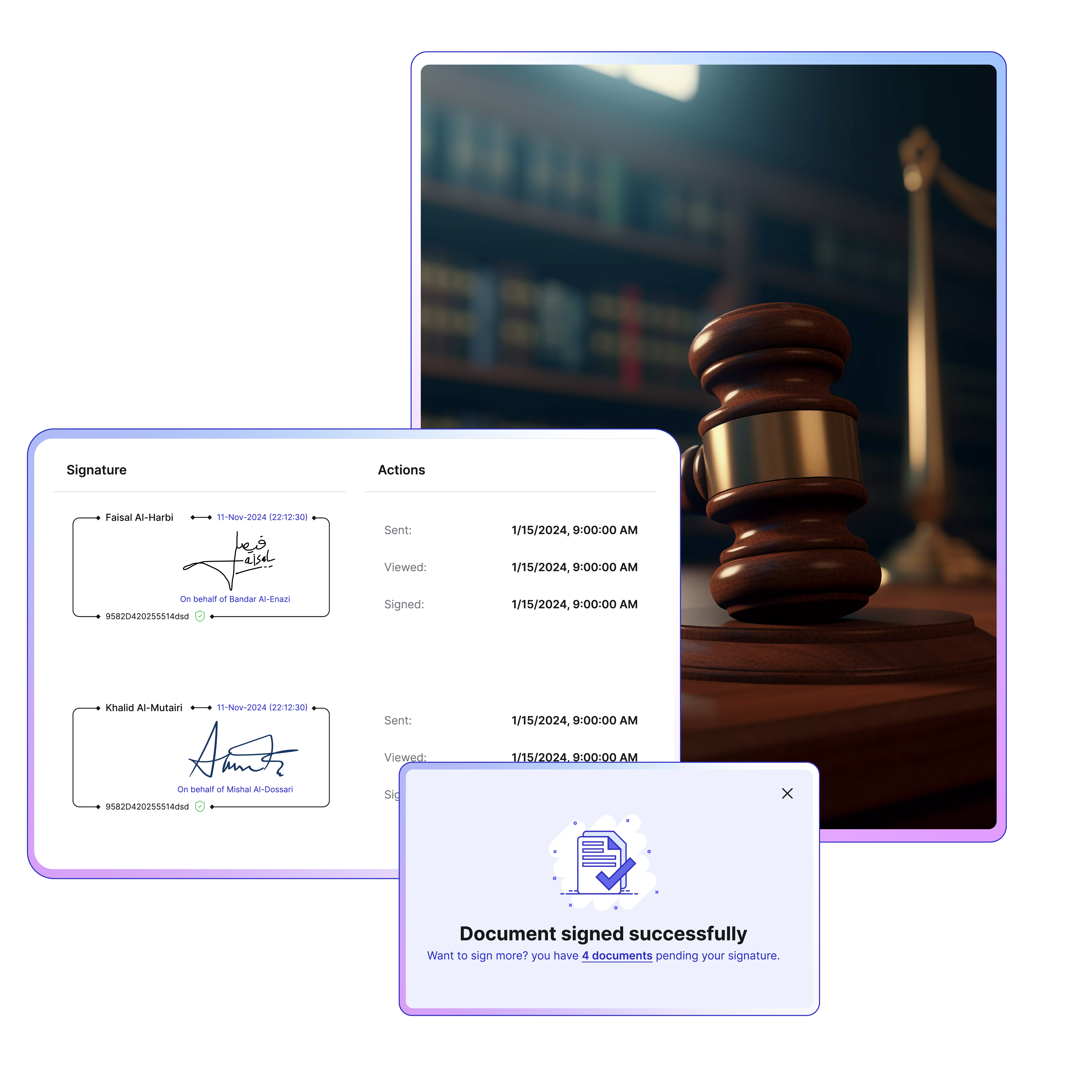 Use Saudi-licensed, court-admissible e-signatures backed by full audit trails, identity verification, and time-stamped records.