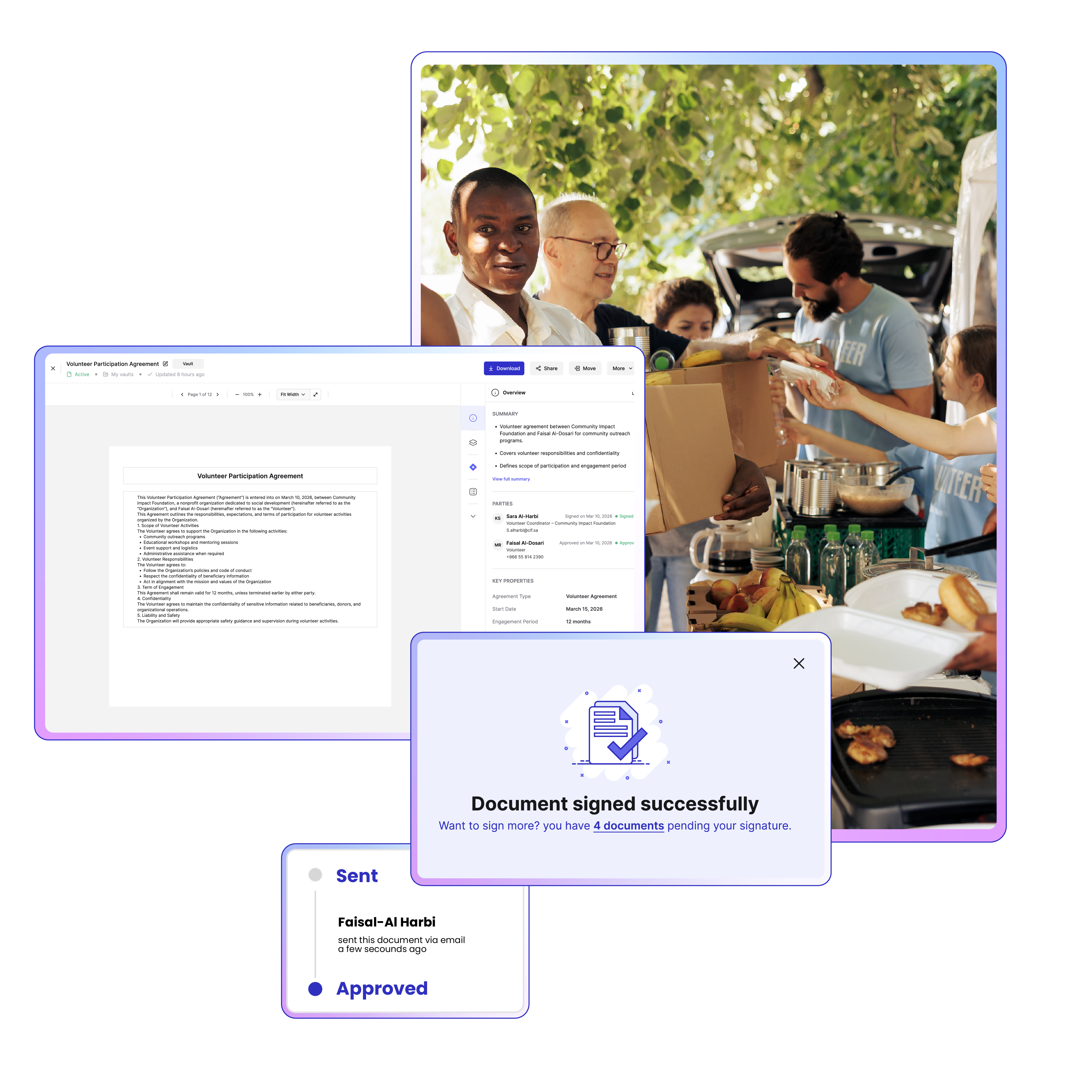 Enable volunteers, donors, and partners to sign agreements remotely with secure, mobile-friendly workflows.