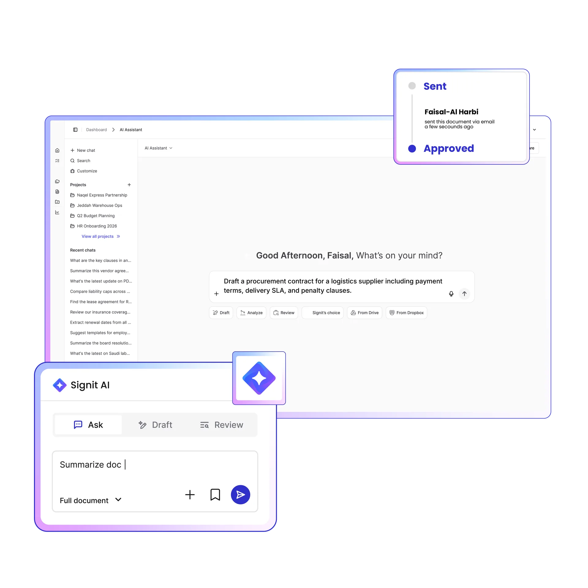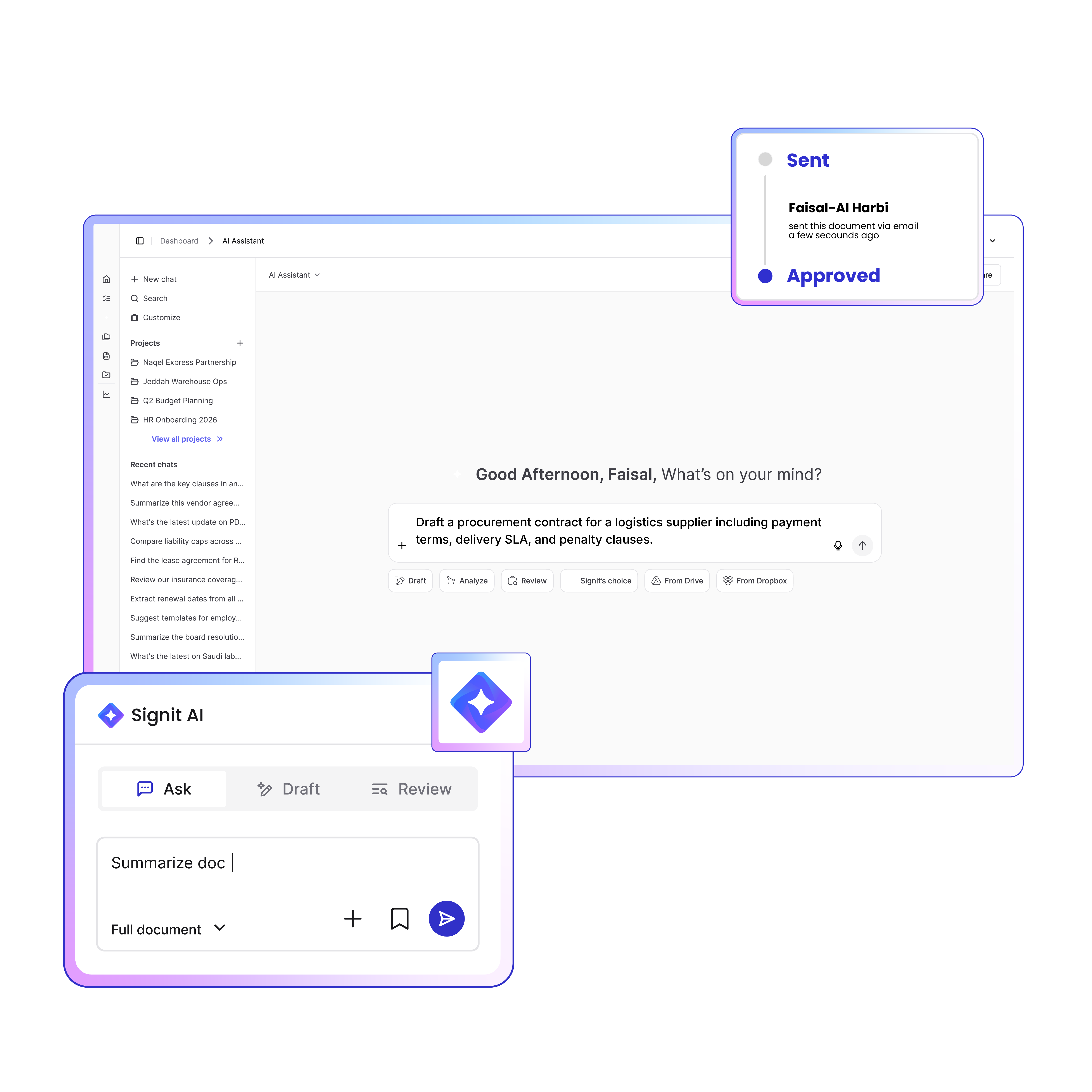 Accelerate supplier contracting and enforce compliance at every stage — from request to renewal. With Signit, procurement teams get one secure, Saudi-compliant platform to automate workflows, gain visibility, and maximize supplier value.